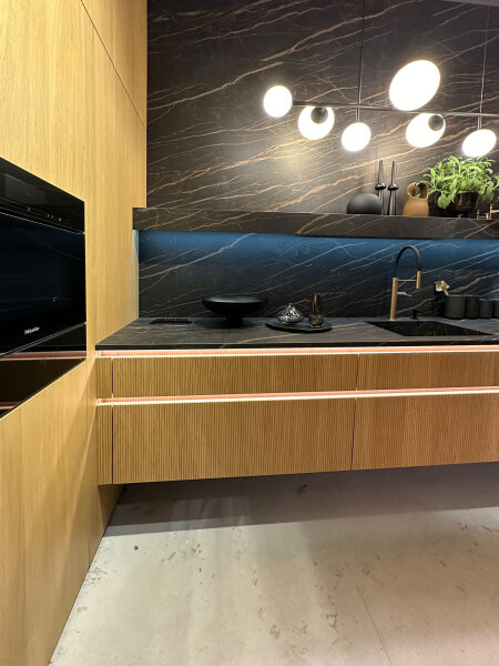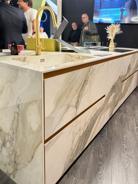 Les grands noms confirment leur rôle de favoris. Lube, Doimo, Eggersmann, Next125, Valcucine, etc., montrent ce que l'on attend d'eux : des conceptions de cuisine haut de gamme pour un public aisé. La 'qualité premium' se retrouve non seulement dans les façades et les matériaux, mais aussi dans les systèmes de tiroirs et l'éclairage LED au-dessus, en dessous et à l'intérieur des armoires, essentiels dans une cuisine de qualité.