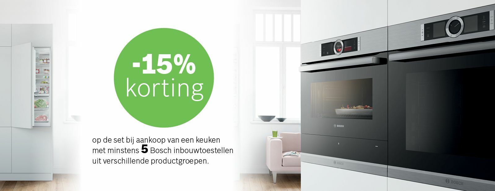- -15% op de set bij aankoop van een keuken met minstens 5 Bosch inbouwtoestellen uit verschillende productgroepen.
